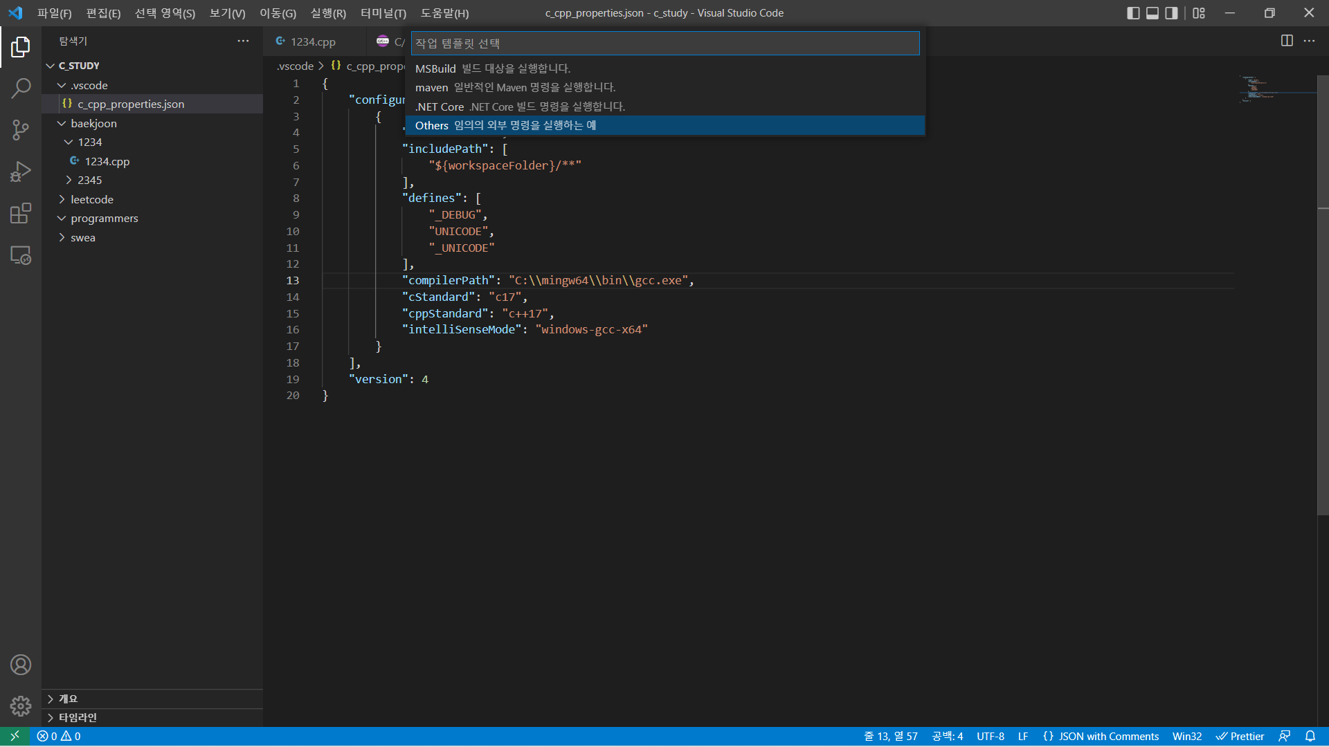 이번 시간에는 저번시간 컴파일러 설치에 이어 c++ 개발환경설정을 위해 vscode를 설정해보겠습니다. 먼저 vscode extension을 설치해보겠습니다. vscode에 들어오셔서 맨왼쪽 이런 아이콘을 누르고 검색창에 c++이라고 치시면 다양한 extension들이 나옵니다. 여기서 C/C++ C/C++ Extension Pack C++ Intellisense C/C++ Theme 정도 설치해주시면 됩니다. 참고로 vscode 한국어 번역을 원하시면 검색창에 korean 치시고 Korean(사용법) Language Pack for Visual Studio Code 설치해주시면됩니다. 그리고 이제 vscode를 설정해주기 전에 파일을 생성해야합니다. 원하시는 곳 아무데나 폴더를 만들어서 vscode 파..
